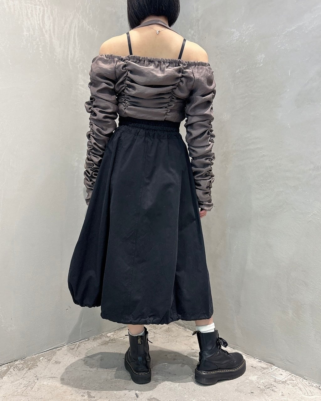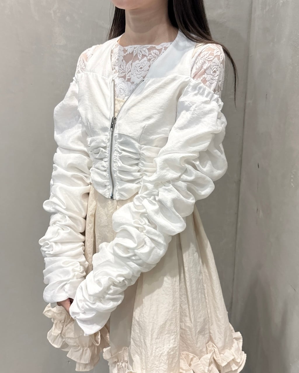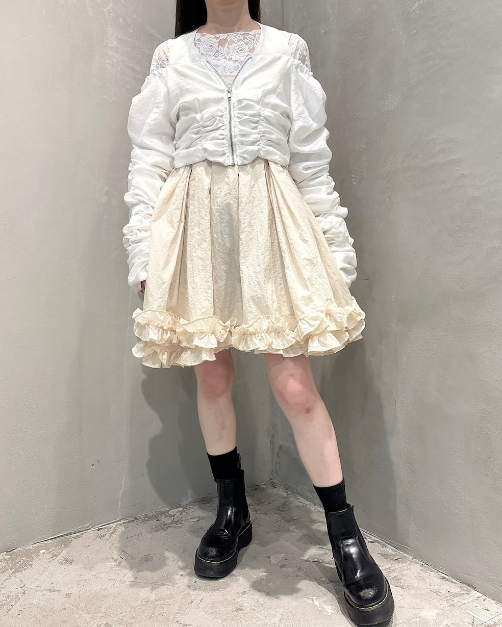 シアー生地にシャーリングがたっぷり施された