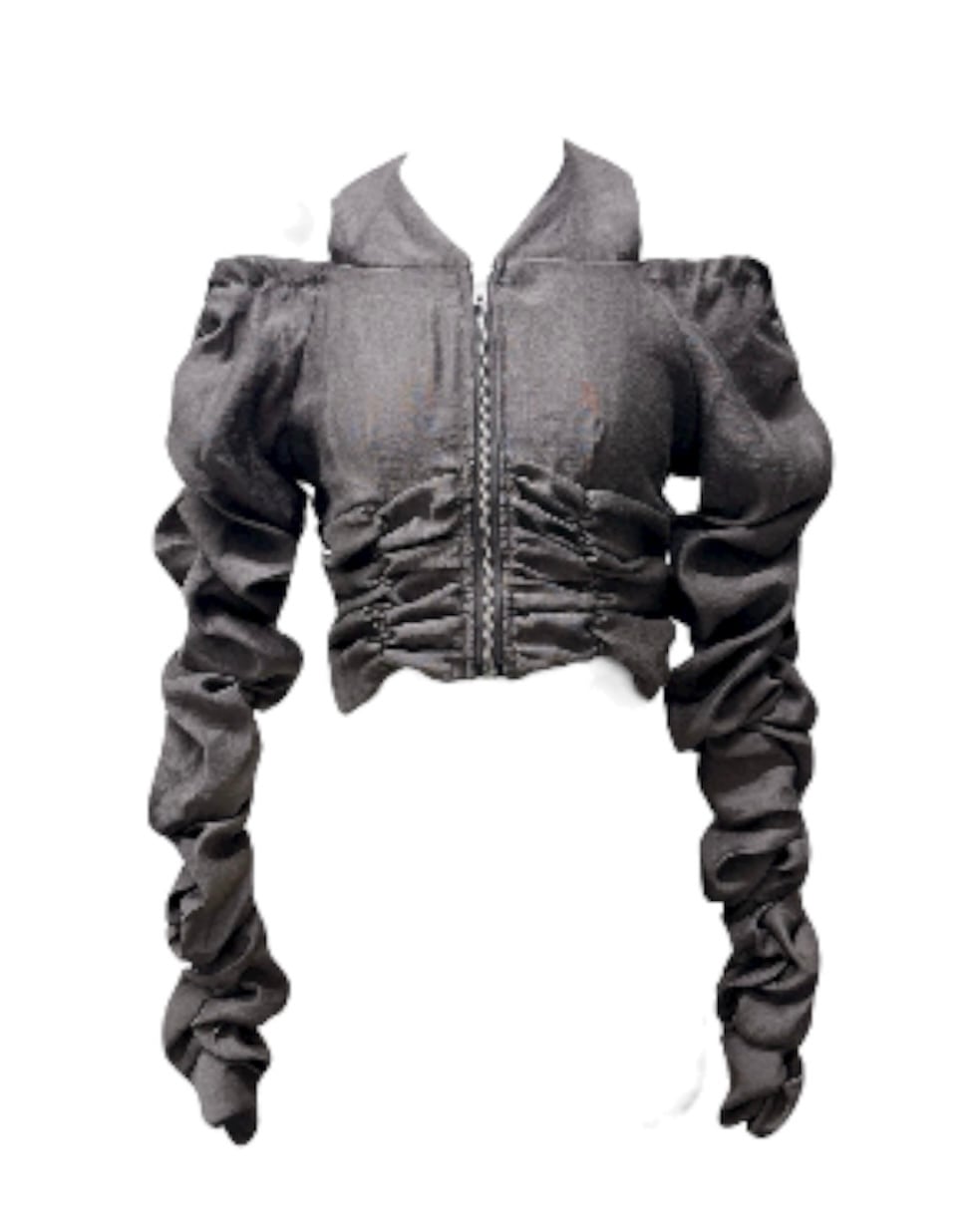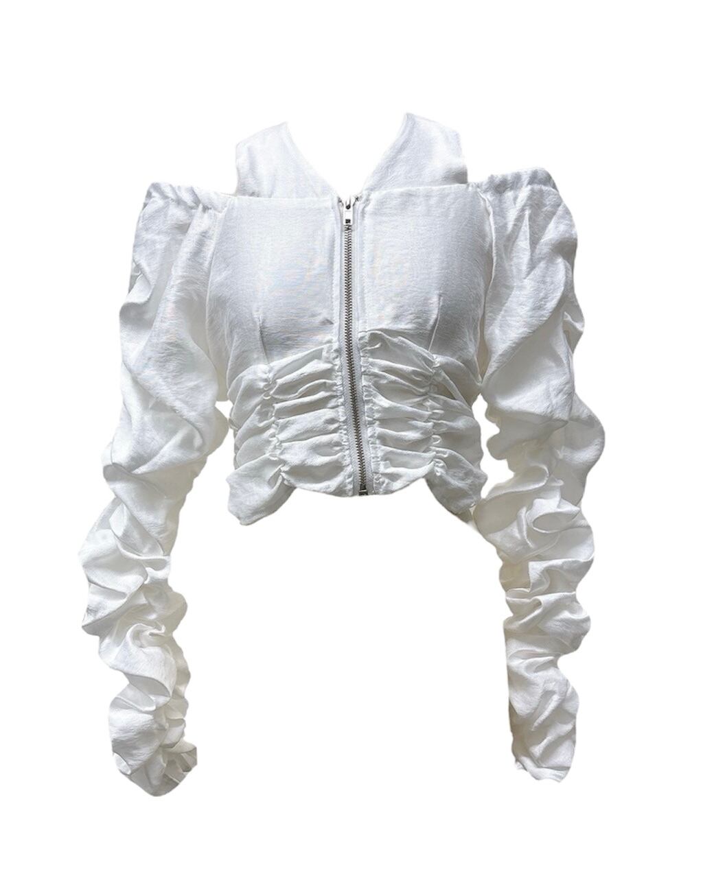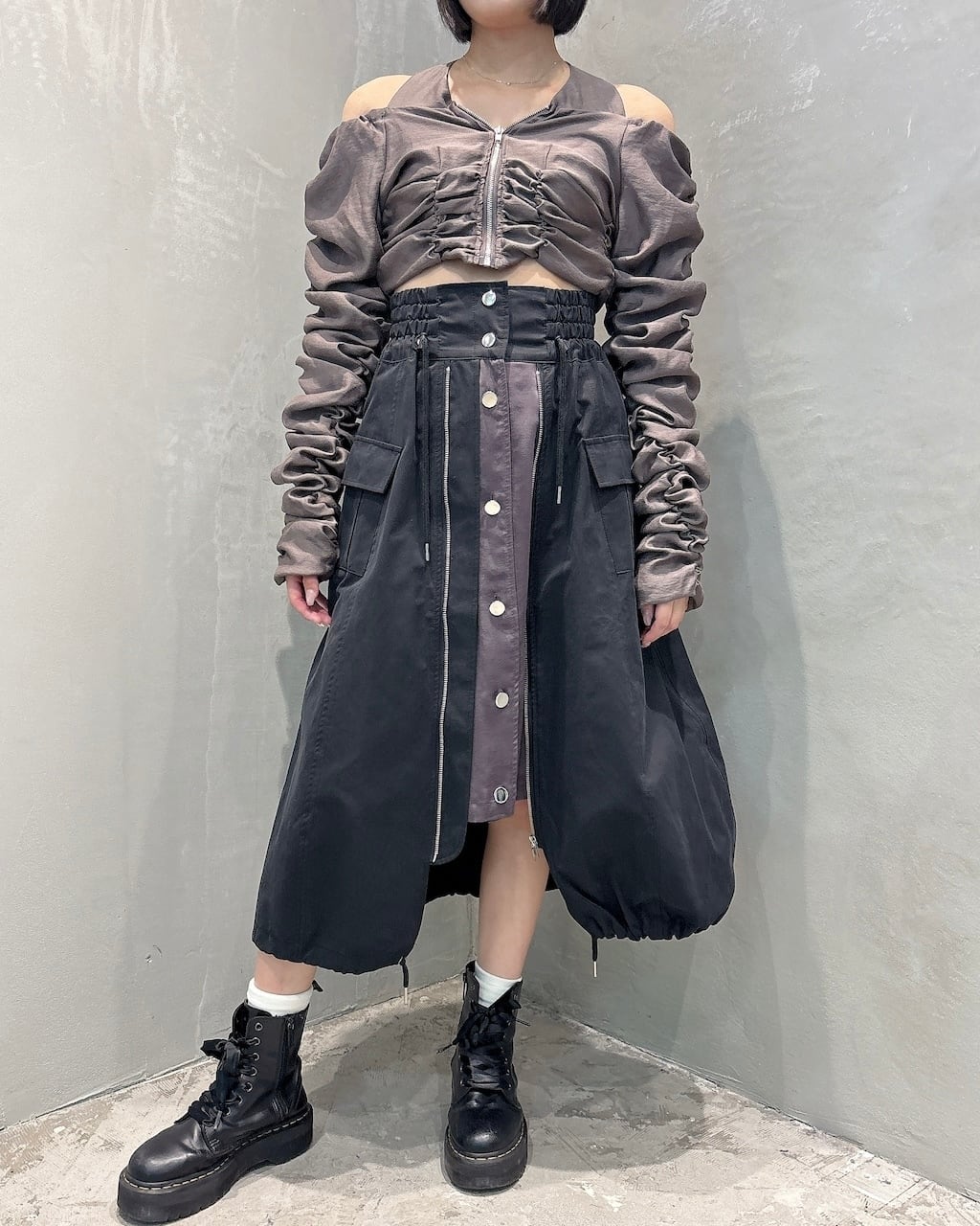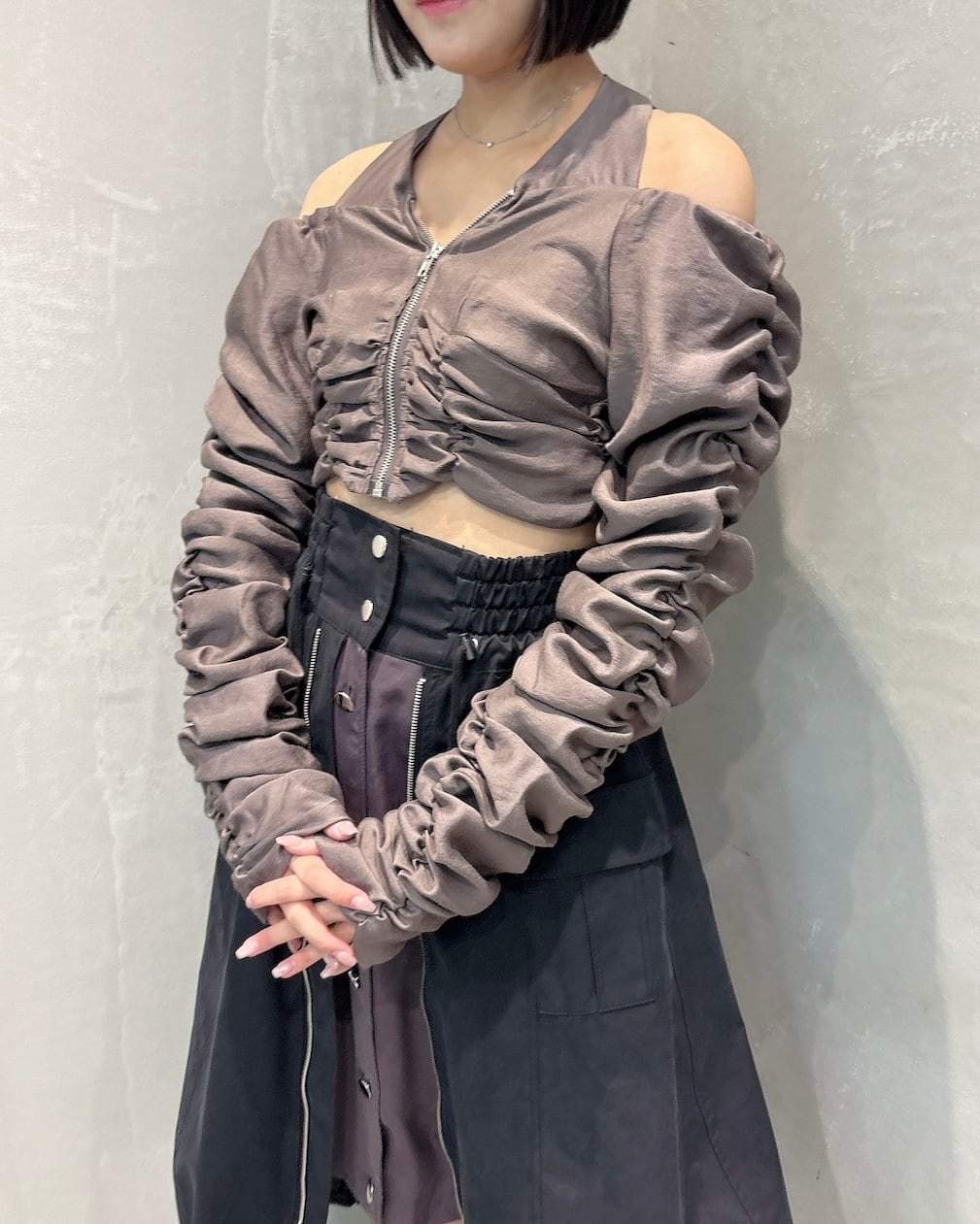 シアー生地にシャーリングがたっぷり施された