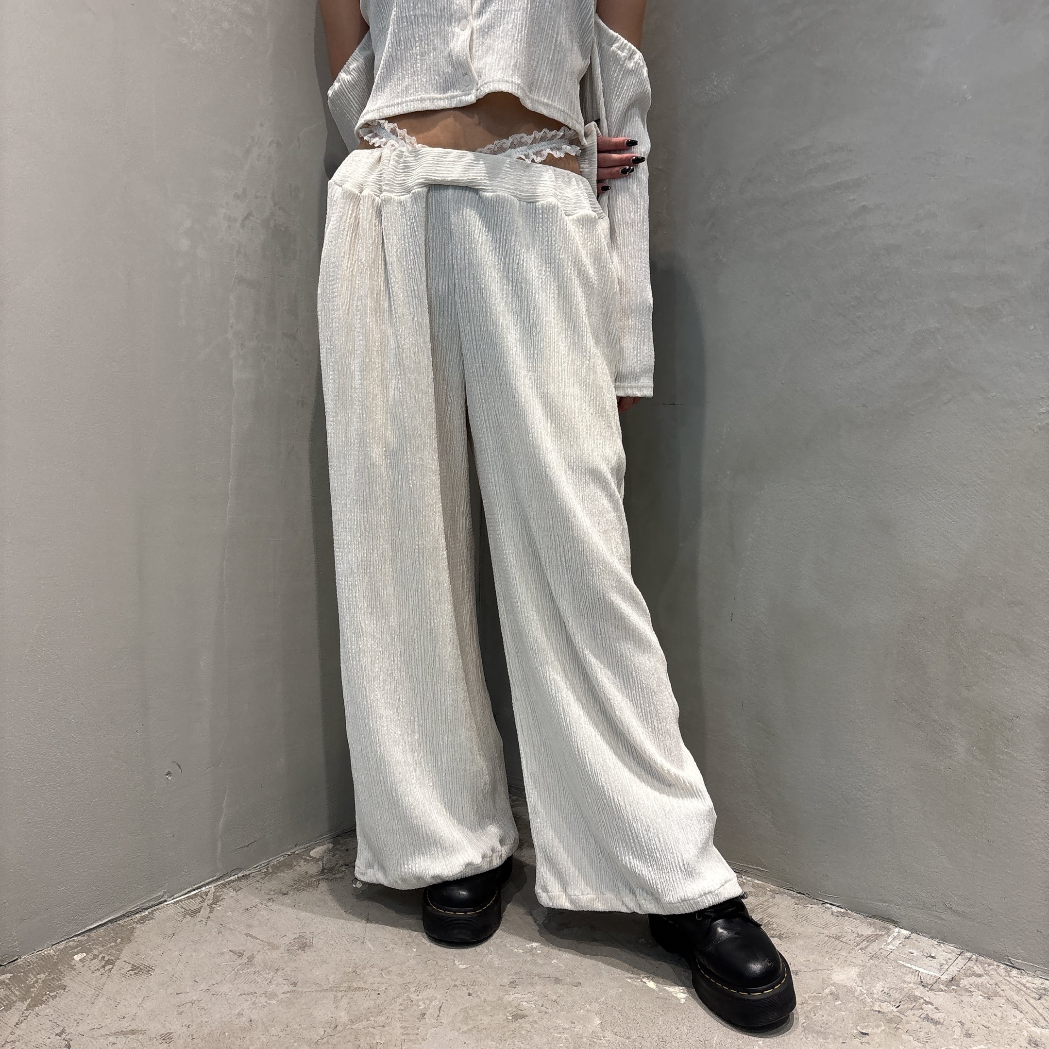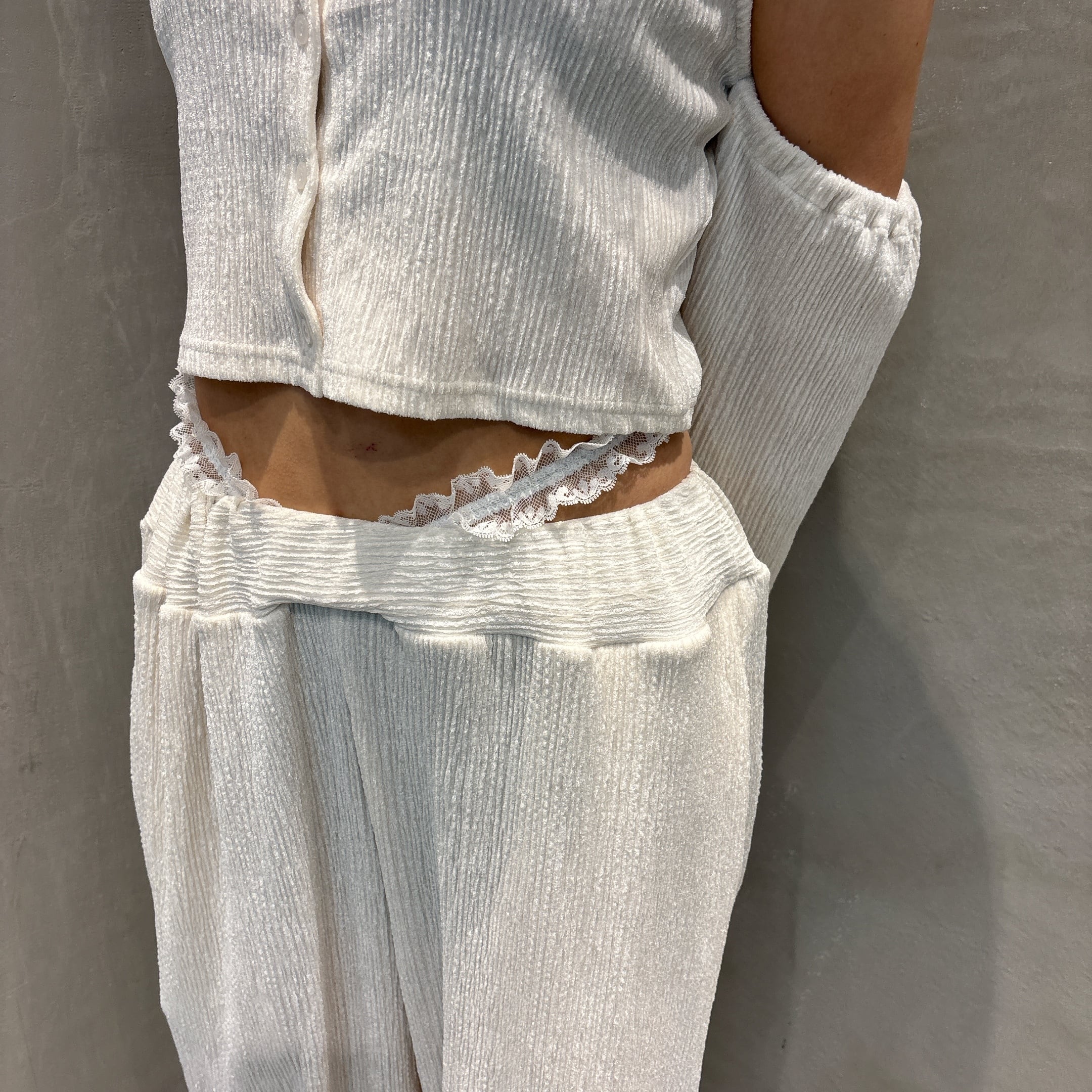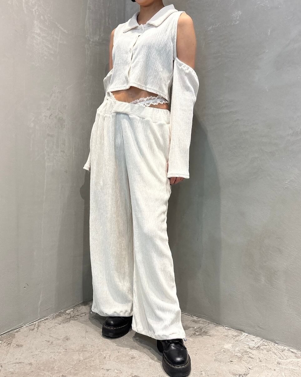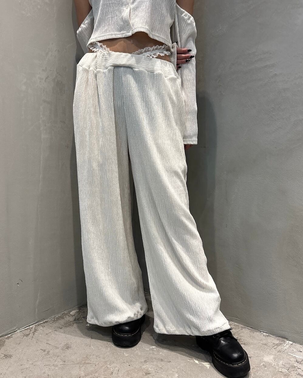 レーステープをウエストに合わせ、ローウエストで履く、ベロア生地を使用したパンツ。