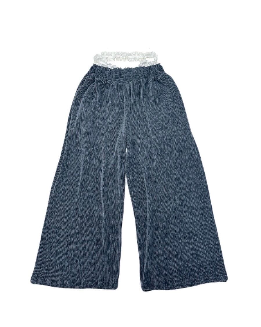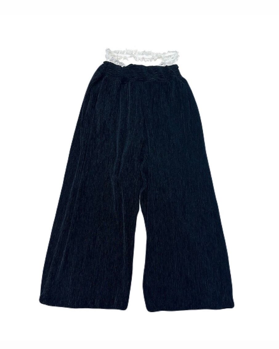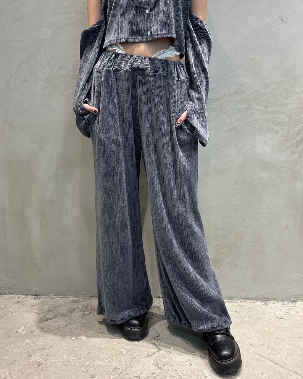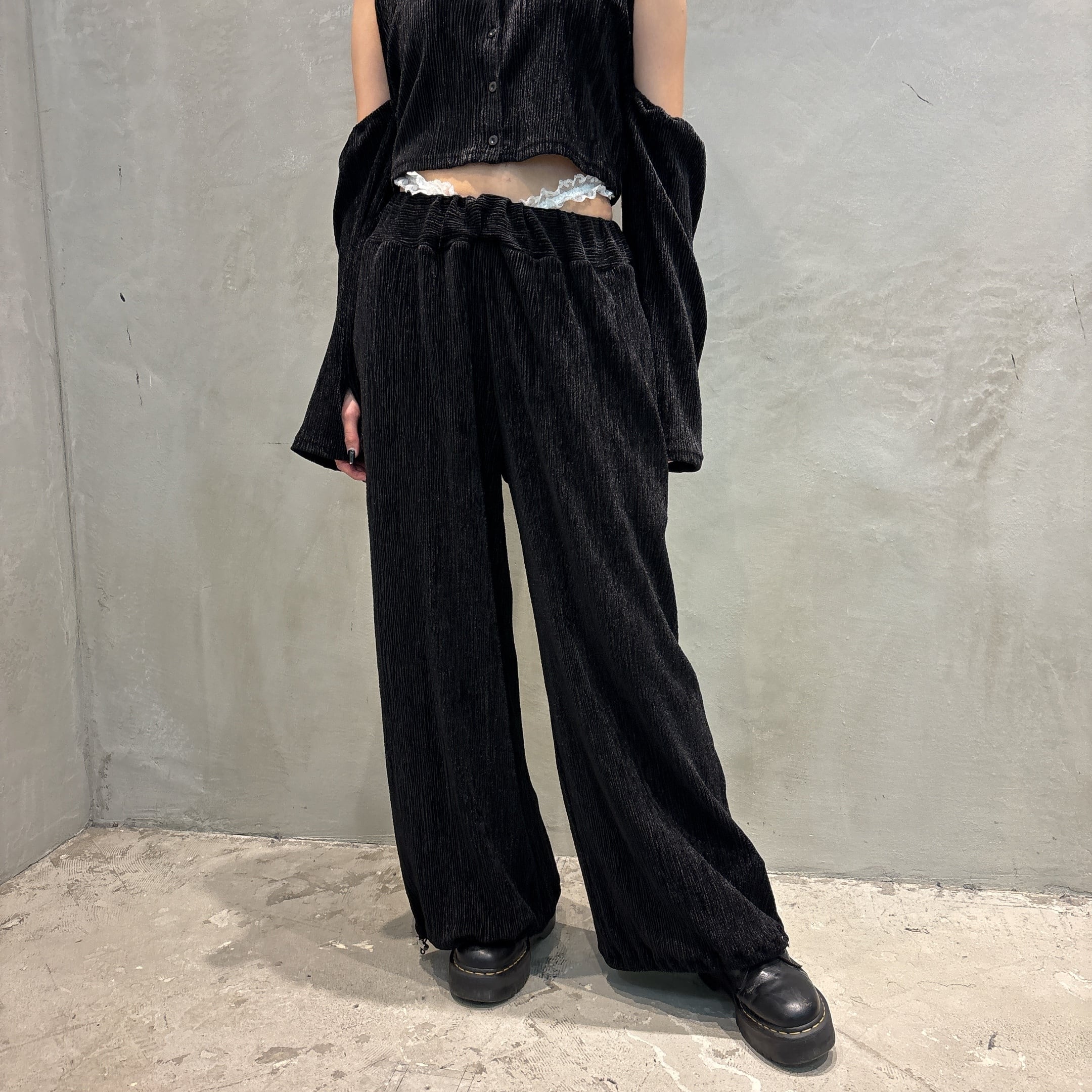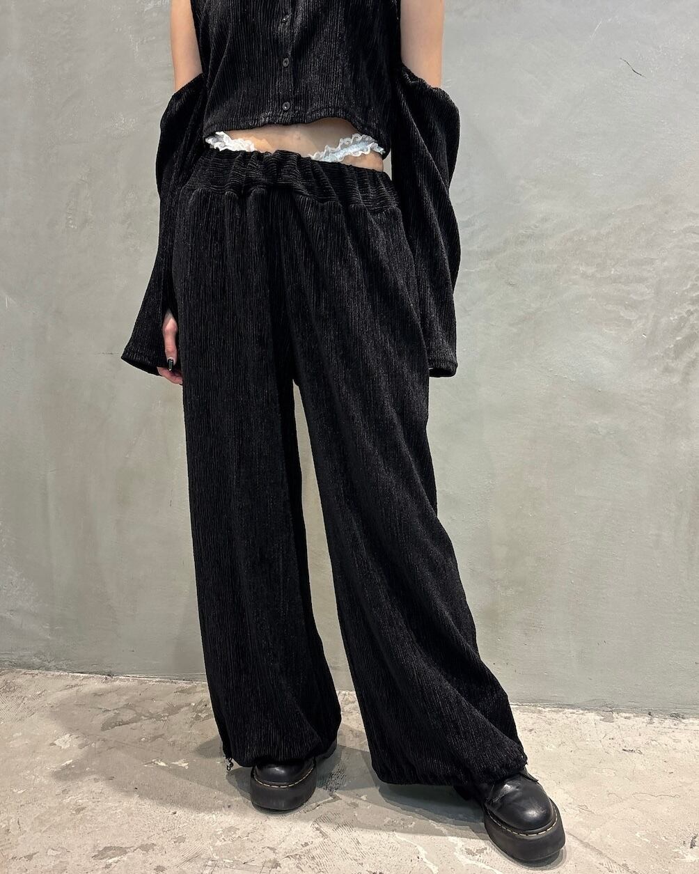 レーステープをウエストに合わせ、ローウエストで履く、ベロア生地を使用したパンツ。