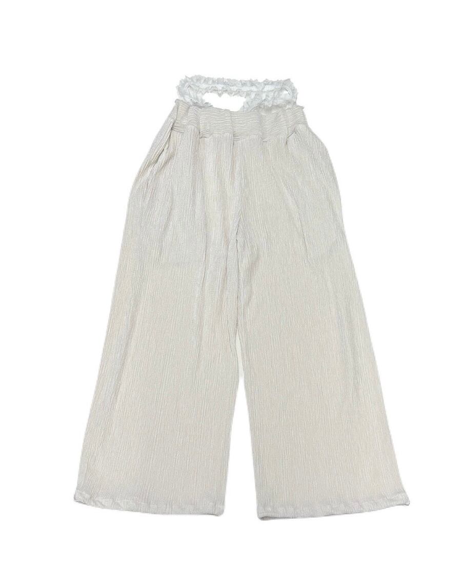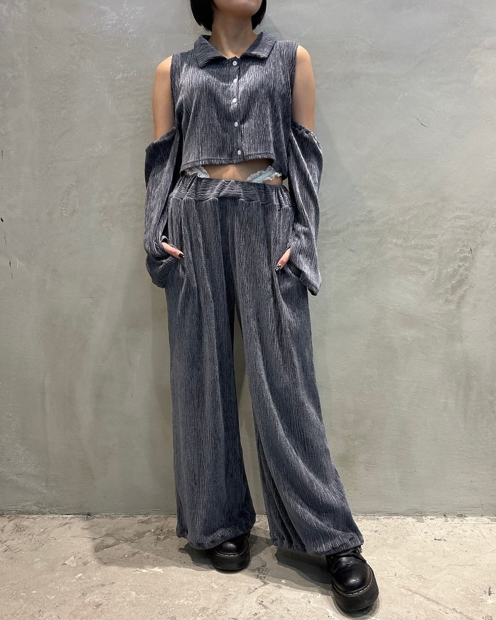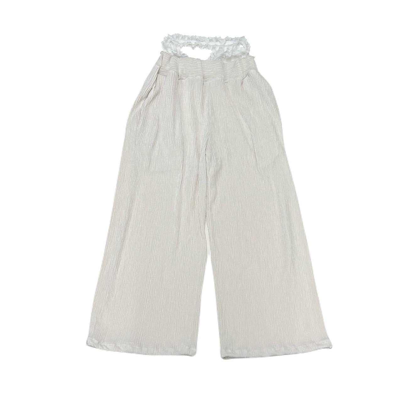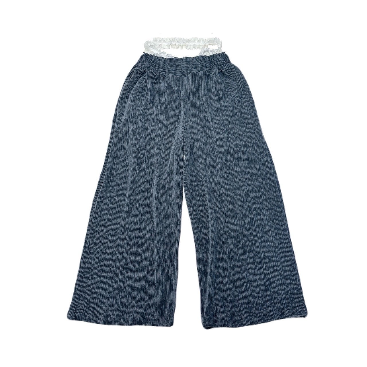 レーステープをウエストに合わせ、ローウエストで履く、ベロア生地を使用したパンツ。